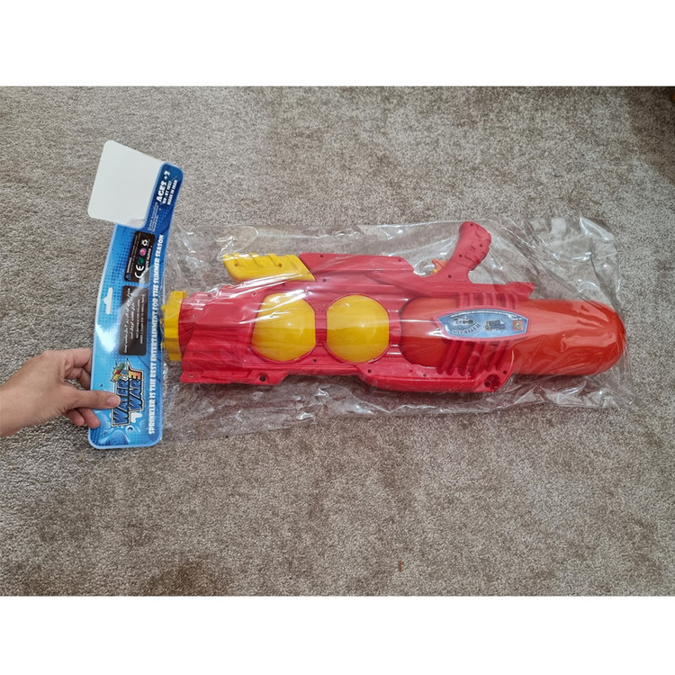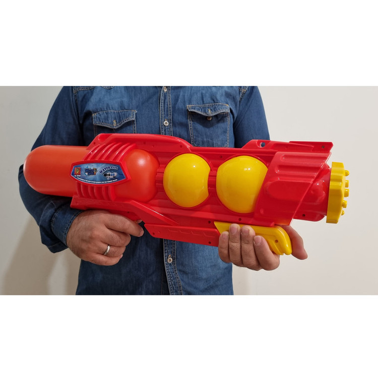 این تفنگ آبپاش دارای یک منبع نسبتا بزرگ است. منبع را پر از آب کنید و در محل خود قرار دهید سپس با حرکت اهرم جلویی در مخزن فشار هوا ایجاد کنید. حالا با فشار دادن ماشه آب بازی را شروع کنید.